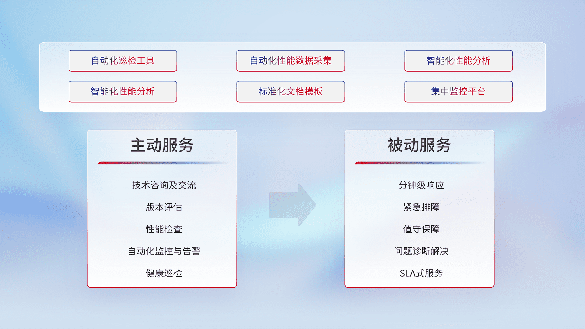 智能化工具和标准化文档,,保障服务质量,,,提供主动服务(包含技术咨询、、、版本评估、、、、性能检查、、自动化监控与告警、、、、健康巡检)和被动服务包含(分钟级响应、、、紧急排障、、、、值守保障、、问题诊断解决、、、、SLA服务)。。。